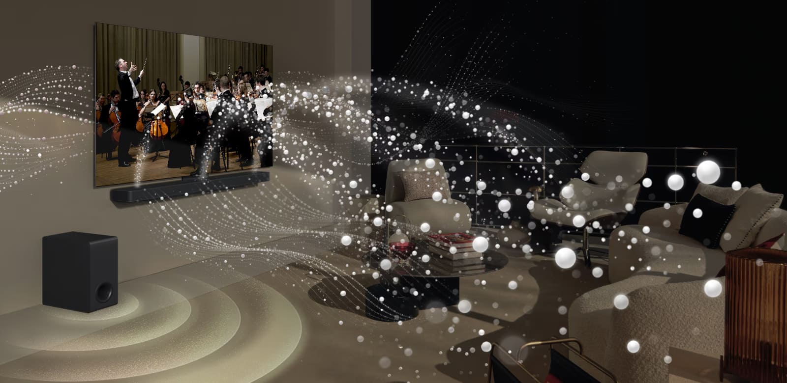 The unique sound, range, and tonal qualities of your LG Soundbar and LG TV come together in harmony for an engrossing and impactful sonic experience.