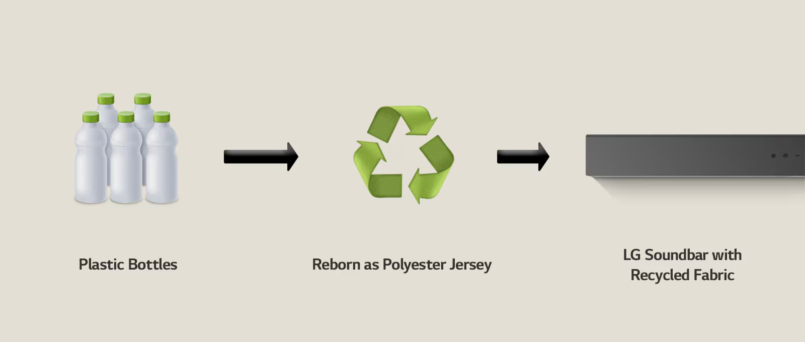 ALL LG Soundbars are thoughtfully desinged with careful consideration to ensure a high percentage of reclaimed materials.The Global Recycled Standard certifies that the polyester jersey fabric is made from plastic bottles.